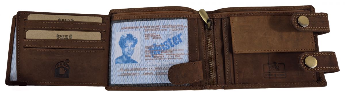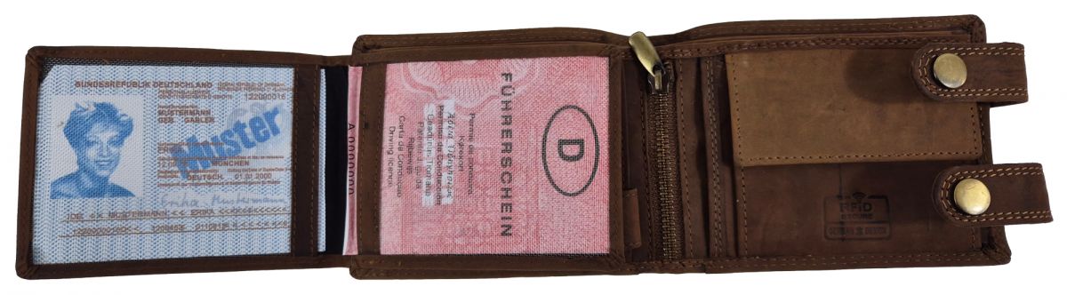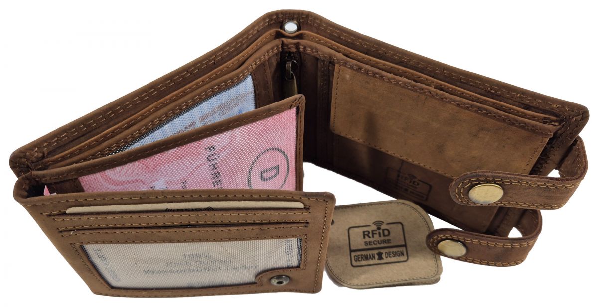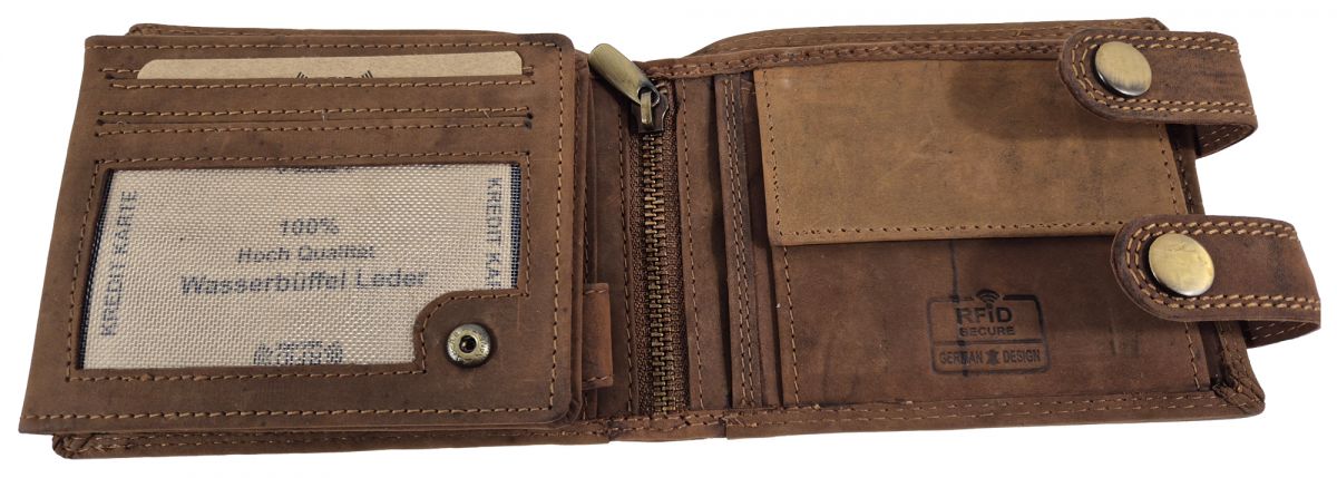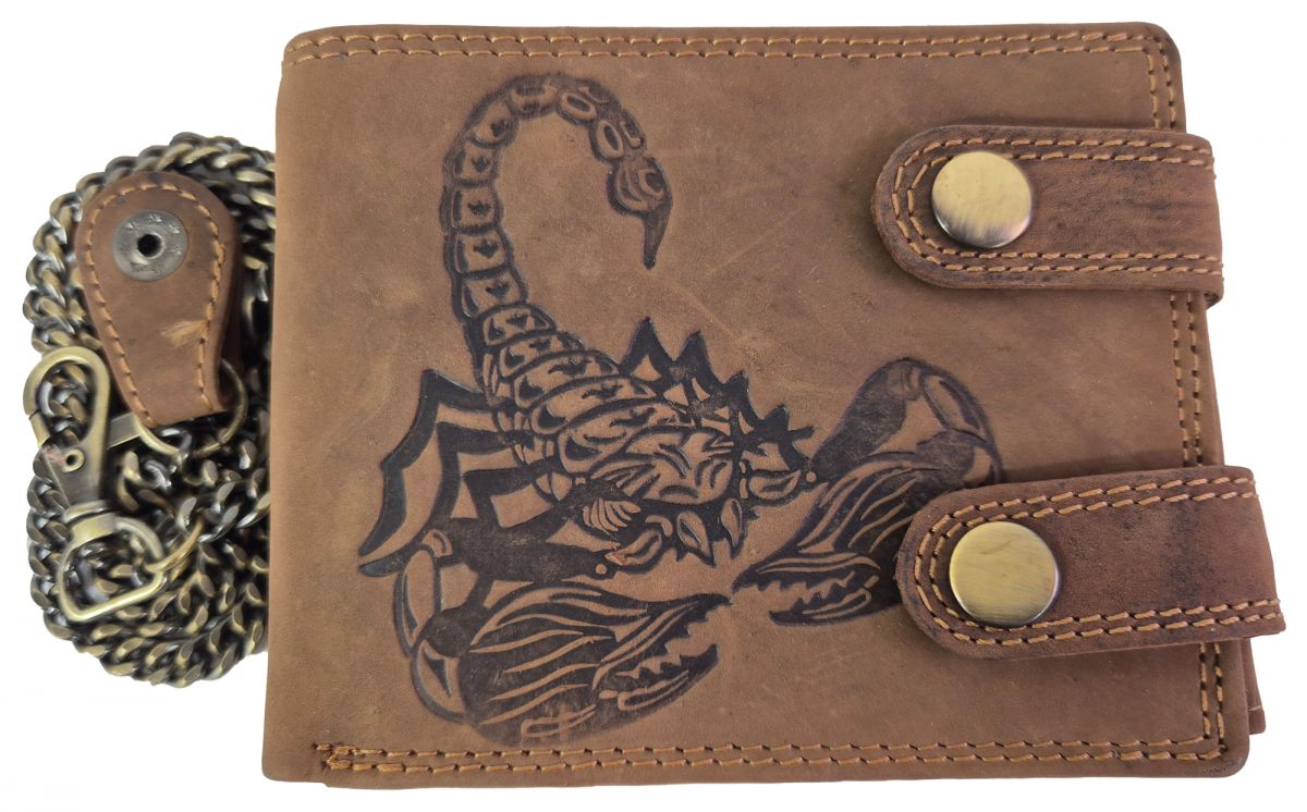 Dieser Geldbeutel passt ideal zu jedem Sternzeichen Skorpion. Die Geldbörse wurde aus echtem Büffel-Leder und mit einer sehr aufwändigen Ausstattung gefertigt. Das Leder wurde rustikal naturbelassen. Da wurde keine Farbe und kein Plastik verwendet. Hier haben Sie noch das echte natürliche Leder in der Hand. Auf der Vorderseite ist ein Skorpion geprägt. Der Geldbeutel sieht sehr edel aus. Der Geldbeutel bietet 4 Durchsichtfächer für Fotos, Führerschein oder KFZ-Schein. Außerdem gibt es 6 Kartenfächer. 2 genähte Geldscheinfächer und ein Münzenfach mit Druckknopf. Im Münzenfach ist ein spezielles Fach mit einem Einkaufswagenchip. Dazu gibt es noch 1 Dokumentenfach und ein weiteres Fach, das mit Reißverschluss geschlossen wird. Die Größe beträgt 12x10 cm. Dazu erhalten Sie noch eine abnehmbare auf antik getrimmte Messingkette mit Karabinerhaken. Und selbstverständlich ist der Geldbeutel auch RFID-gesichert gegen Datendiebstahl. Der perfekte Geldbeutel für das Sternzeichen Skorpion.