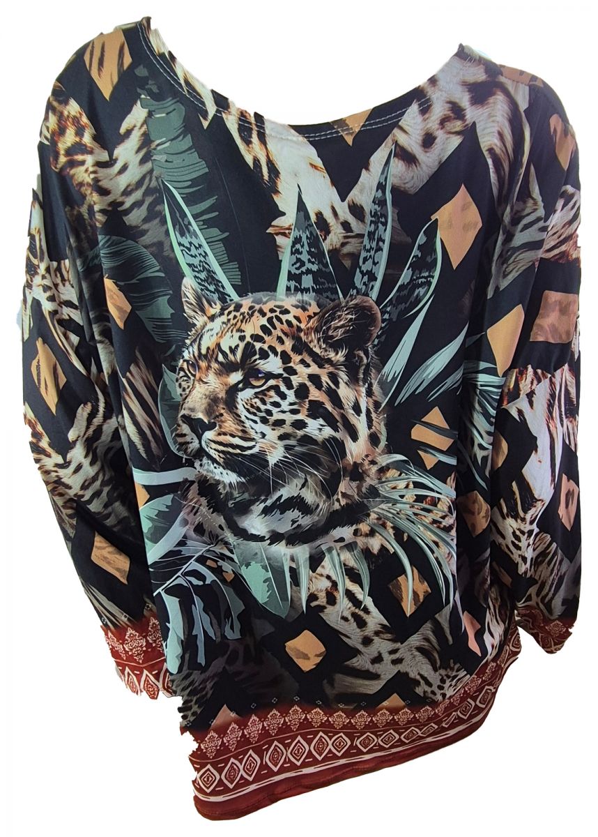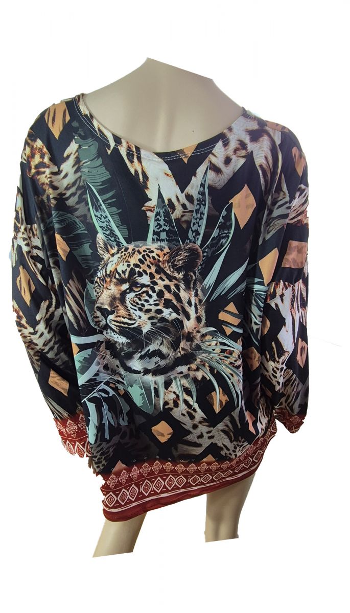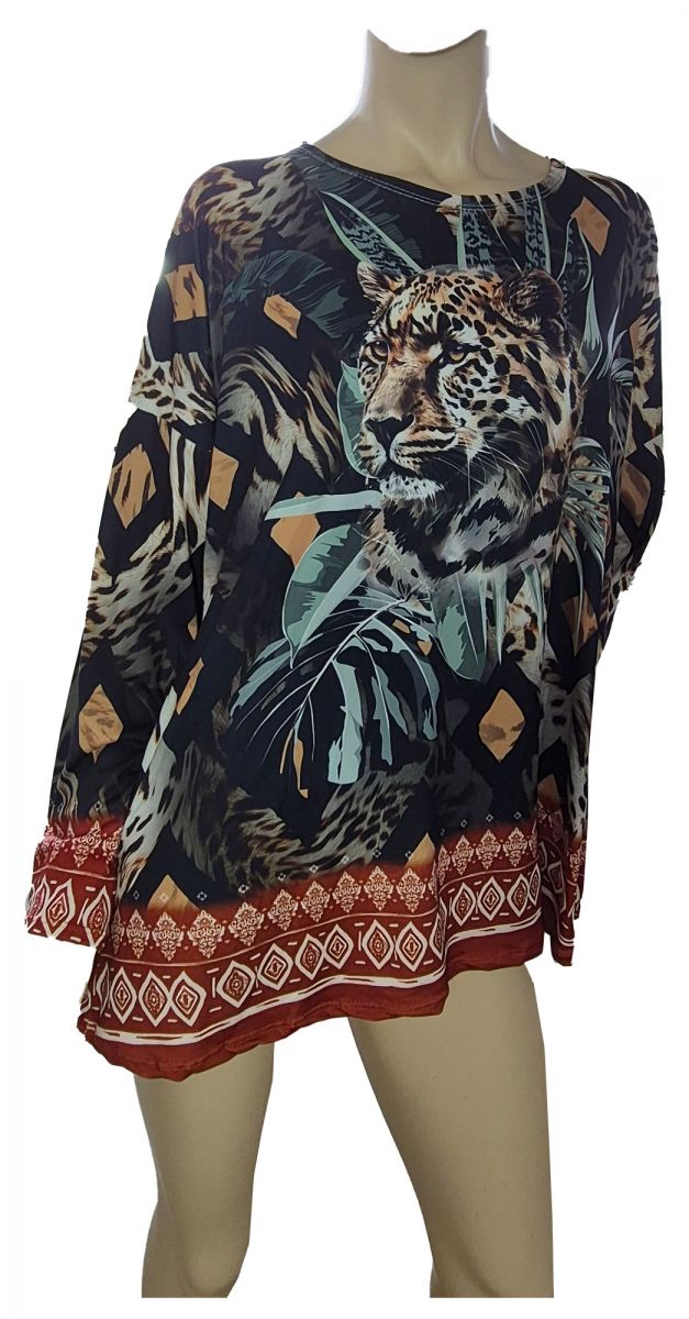 Leopard ist in der Mode total IN derzeit. Aber die allerschönste Tunika zum Thema Leopard finden Sie bei Einkaufszauber. In einem abstrakten Muster, das an einen Dschungel erinnert, finden Sie einen Leoparden versteckt. Ob der wohl auf seine Beute wartet? Diese Langarm-Tunika hat eine Einheitsgröße, die den Konfektionsgrößen L-XXL bzw. 42 bis 48 passt. Die Taillenweite beträgt ca.58cm, die Gesamtlänge ab Schulter 70cm und die Ärmellänge ab Schulter 55 cm. Die Tunika ist angenehm zu tragen. Material: 95% Viskose, 5% Elasthan. Made in Italy - wo die besonders chicke Mode gemacht wird. Mit dieser modischen Tunika werden Sie garantiert überall wegen Ihres guten Geschmacks bewundert.