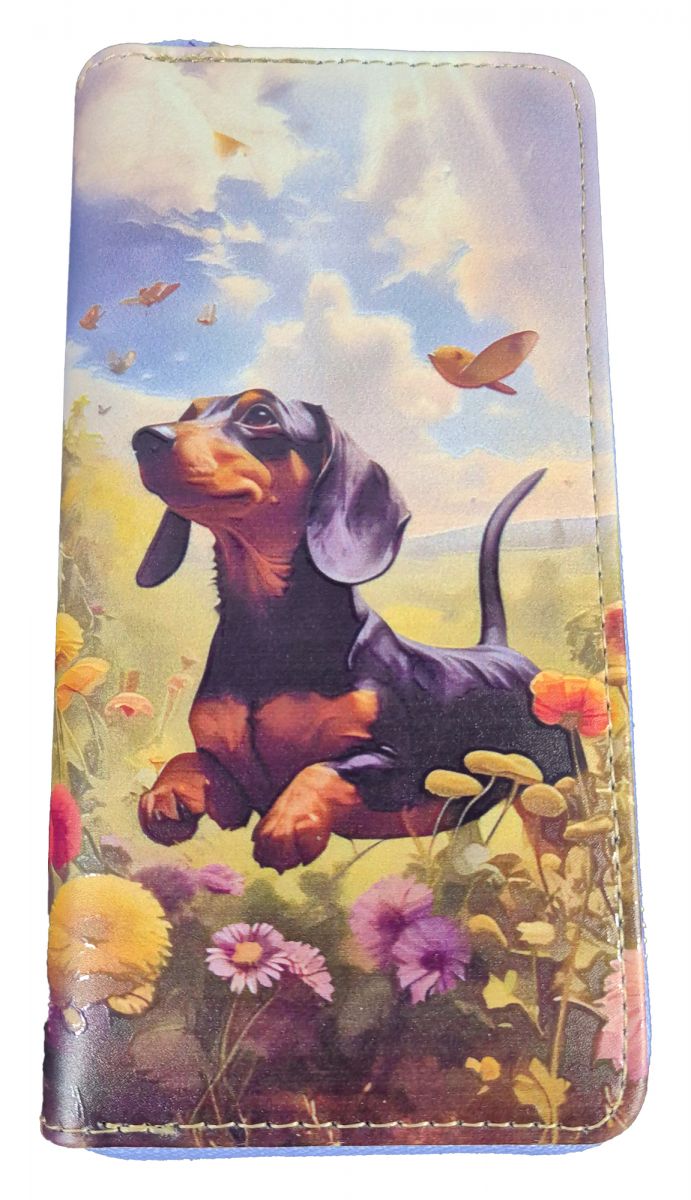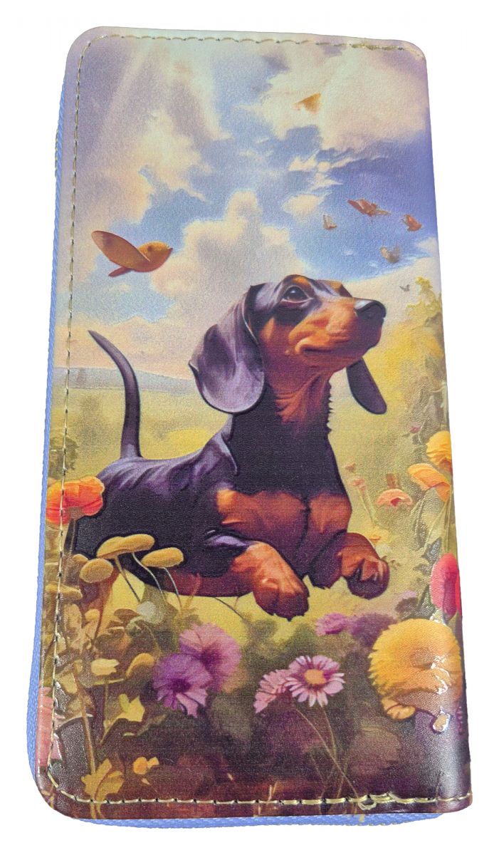 Der absolute Hit für jede Dackel-Besitzerin und auch für alle anderen Hundefreunde. Der Dackel auf diesem Geldbeutel läuft über die Blumenwiese und jagt die Schmetterlinge. Total süß. Der Geldbeutel ist mit Reißverschluss verschlossen. Er bietet ein Geldscheinfach, ein Münzenfach mit Reißverschluss und sage und schreibe 12 Kartenfächer. Da kann man gut Ordnung halten darin. Die Größe beträgt 19x10x3 cm. Material: 90% Polyurethan, 5% Polyester, 5% Metall. Ein tolles Geschenk für jede Hundebesitzerin. Vielleicht schenken Sie sich das gute Stück auch gleich selber?