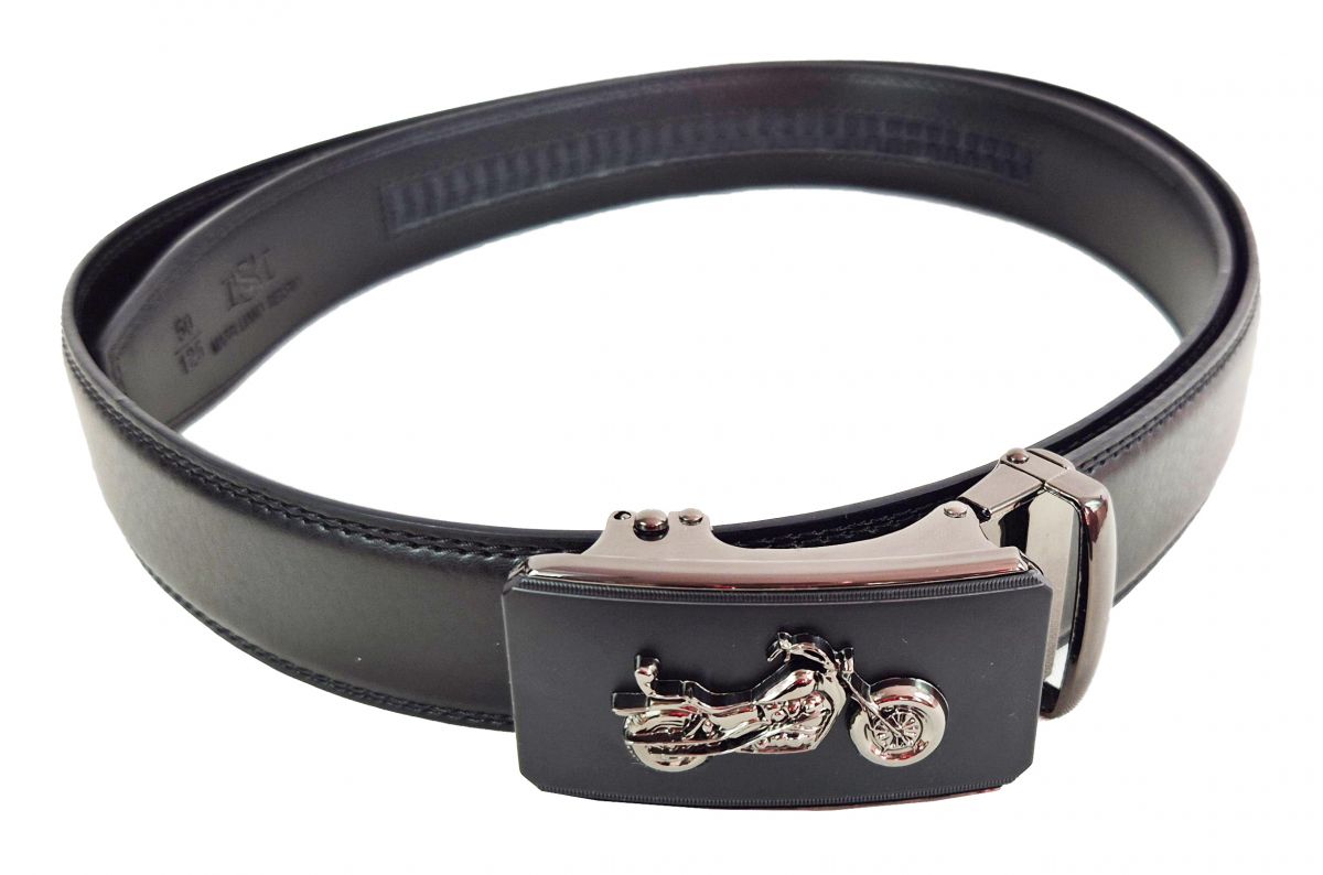 Das ist der richtige Gürtel für jede Motorradbraut oder für den elegant gekleideten Motorradfahrer. Auf der schwarzen Metall-Schnalle ist ein silbernes Motorrad in 3D montiert. Eine richtig flotte Maschine. Diese Schnalle hat auch eine geniale neuartige Technik. Dieser Gürtel hat keine Löcher mehr. Man schiebt das Gürtelende einfach in die Schnalle und dann arretiert er sich von selbst. In der Innenseite sind Raster eingeprägt, in die sich der Gürtel ganz von alleine befestigt. Wenn man dann einen kleinen Hebel drückt, löst er sich wieder und lässt sich ganz leicht auseinander ziehen. Der Gürtel lässt sich im Umfang auf diese Weise bis zu 20 cm verstellen. Sie sehen die Funktion in unserem Video. Eine wahrhaft geniale Idee.