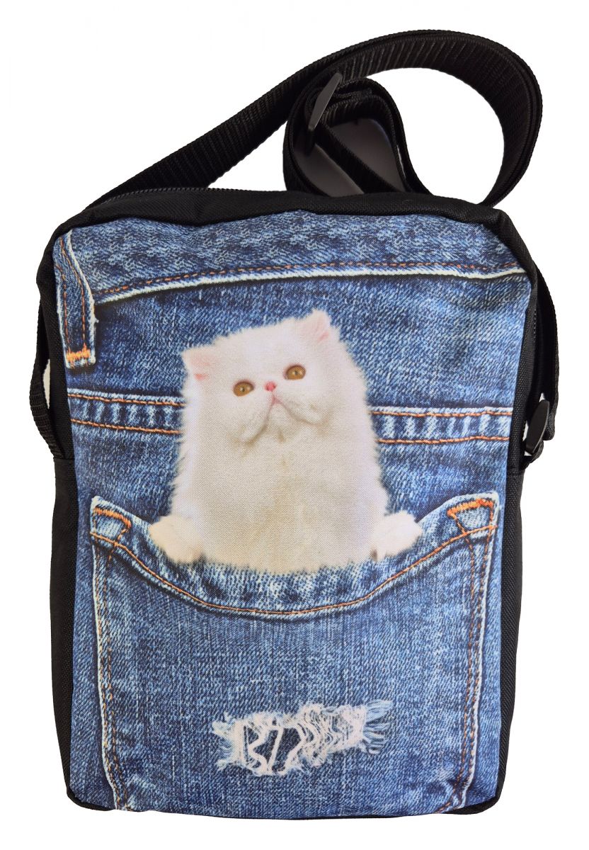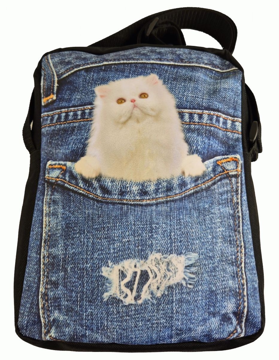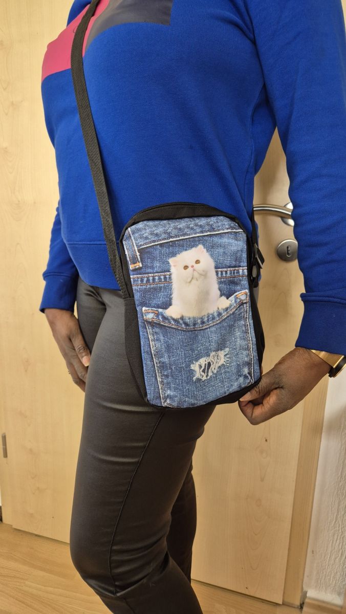 Diese Crossbody Handtasche ist der Tophit der aktuellen Mode. Eine süße weiße Katze schaut aus einer Jeanstasche raus. Das schönste Geschenk, das man einer Katzenbesitzerin machen kann. Dieses Bild ist in einem speziellen 3D-Druck hergestellt. Dadurch sieht die Katze richtig plastisch dreidimensional aus. Als würde sie gleich aus der Tasche springen. Die Größe der Tasche beträgt 25x20x4cm. Innen ist sie mit schwarzem Stoff ausgekleidet und hat dort noch eine Seitentasche. Auf der Rückseite gibt es auch eine Seitentasche mit Reißverschluss, die wäre perfekt für das Handy. Der Schultergurt ist sehr weit verstellbar. Material: 100% Polyester. Diese Tasche passt wirklich zu jedem Outfit, ganz besonders aber auch zu jeder Jeans. Um diese tolle Tasche wird sie jedermann beneiden.