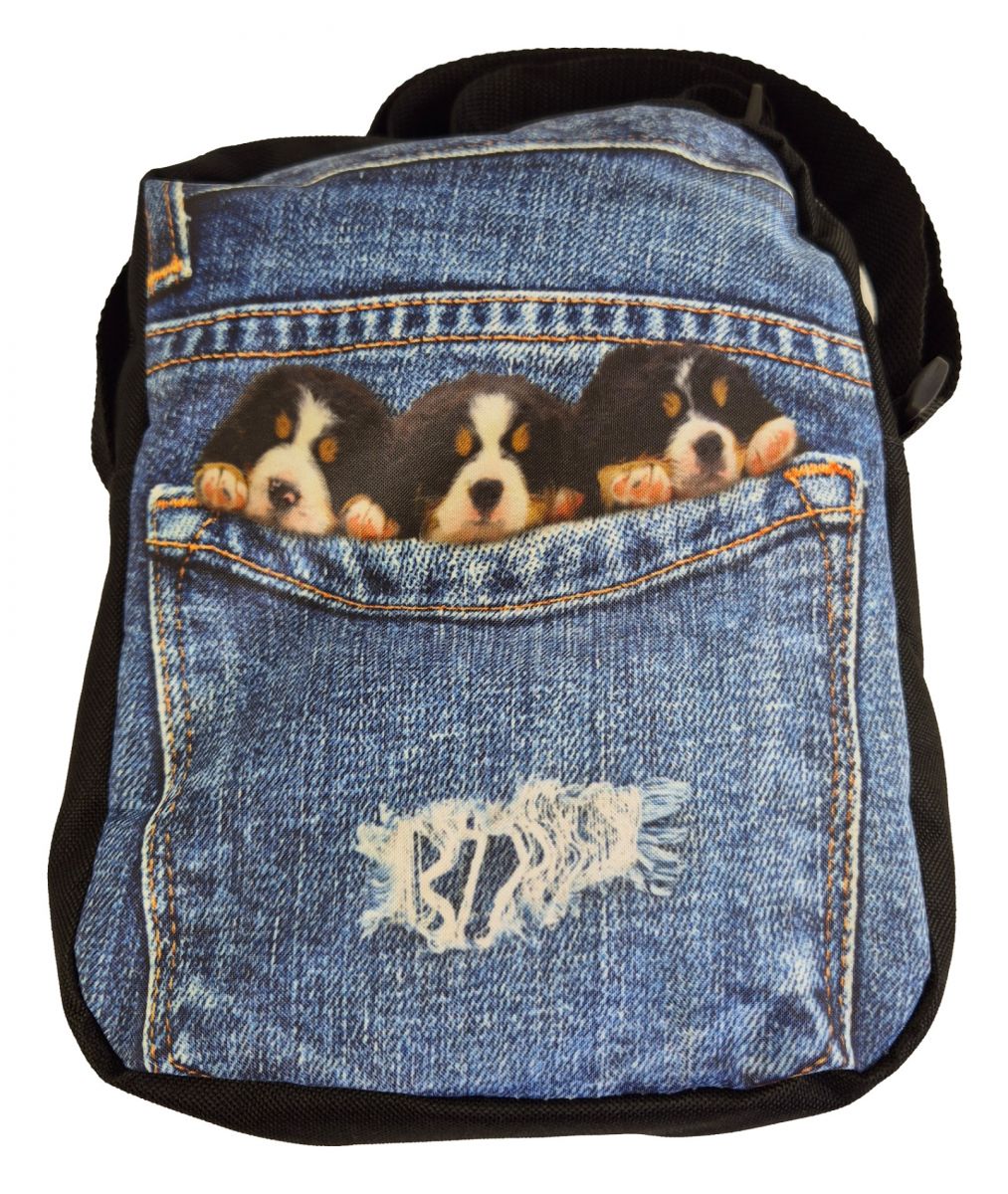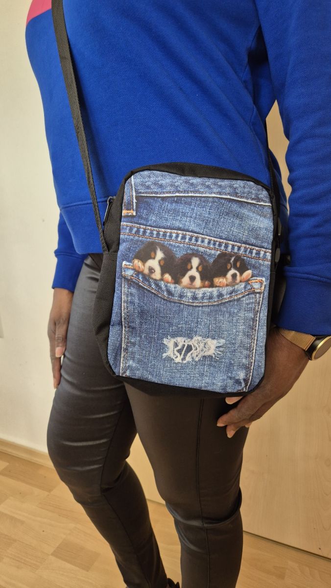Diese Crossbody Handtasche ist der Tophit der aktuellen Mode. Drei total süße Hundebabys schauen aus einer Jeanstasche raus. Das schönste Geschenk, das man einer Hundebesitzerin machen kann. Dieses Bild ist in einem speziellen 3D-Druck hergestellt. Dadurch sehen die drei Hunde richtig plastisch dreidimensional aus. Als würden sie gleich aus der Tasche springen. Die Größe der Tasche beträgt 25x20x4cm. Innen ist sie mit schwarzem Stoff ausgekleidet und hat dort noch eine Seitentasche. Auf der Rückseite gibt es auch eine Seitentasche mit Reißverschluss, die wäre perfekt für das Handy. Der Schultergurt ist sehr weit verstellbar. Material: 100% Polyester. Diese Tasche passt wirklich zu jedem Outfit, ganz besonders aber auch zu jeder Jeans. Um diese tolle Tasche wird sie jedermann beneiden.