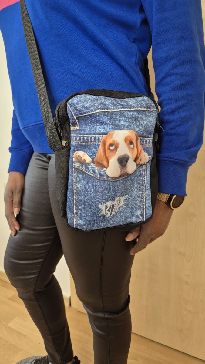 Diese Crossbody Handtasche ist der Tophit der aktuellen Mode. Ein süßer Labrador schaut aus einer Jeanstasche raus. Das schönste Geschenk, das man einer Hundebesitzerin machen kann. Dieses Bild ist in einem speziellen 3D-Druck hergestellt. Dadurch sieht der Hund richtig plastisch dreidimensional aus. Als würde er gleich aus der Tasche springen. Die Größe der Tasche beträgt 25x20x4cm. Innen ist sie mit schwarzem Stoff ausgekleidet und hat dort noch eine Seitentasche. Auf der Rückseite gibt es auch eine Seitentasche mit Reißverschluss, die wäre perfekt für das Handy. Der Schultergurt ist sehr weit verstellbar. Material: 100% Polyester. Diese Tasche passt wirklich zu jedem Outfit, ganz besonders aber auch zu jeder Jeans. Um diese tolle Tasche wird sie jedermann beneiden.