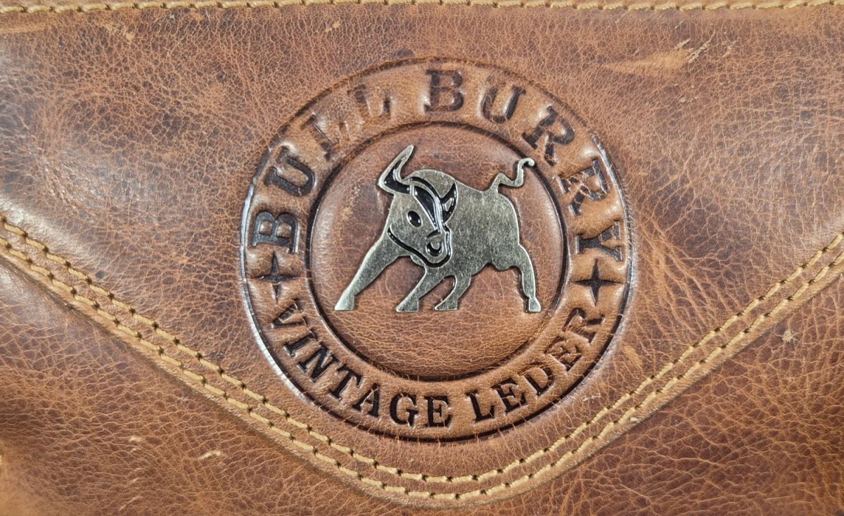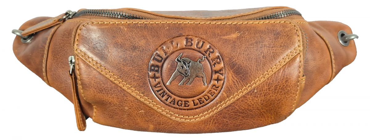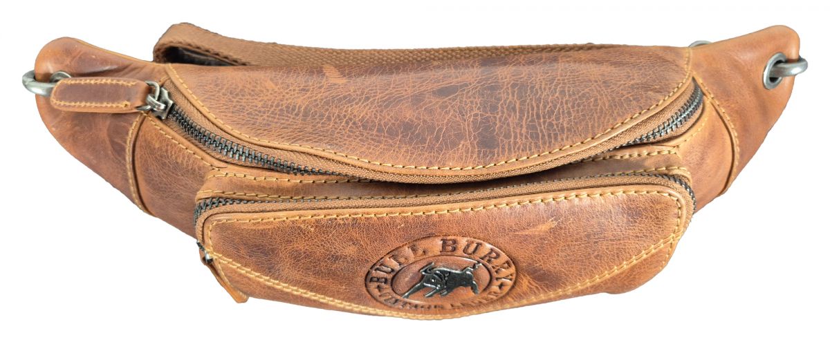 Eine rustikale Bauchtasche aus echtem Leder in einem rustikalen Look. Auf der Vorderseite ist ein wilder Stier aus Metall zu sehen. Deshalb passt diese Tasche auch perfekt zum Sternzeichen Stier.