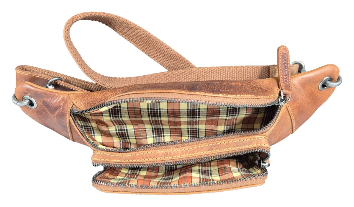 Es gibt ein Hauptfach, ein kleineres Fach vorne und ein Fach auf der Rückseite, das beim Tragen um den Bauch versteckt ist. Alle drei sind mit einem festen Reißverschluss aus Metall verschlossen. Die Innenausstattung ist aus festem kariertem Stoff. Der verstellbare Riemen wird mit Karabinerhaken befestigt. Die Größe beträgt in der Mitte 30x12 cm. Die vordere Tasche hat die Größe 18x10 cm. Der Gurt ist bis 130 cm verstellbar. Material: 90% Leder, 10% Polyester. Wenn Sie diese Tasche tragen, wird jedermann Sie darum beneiden.
