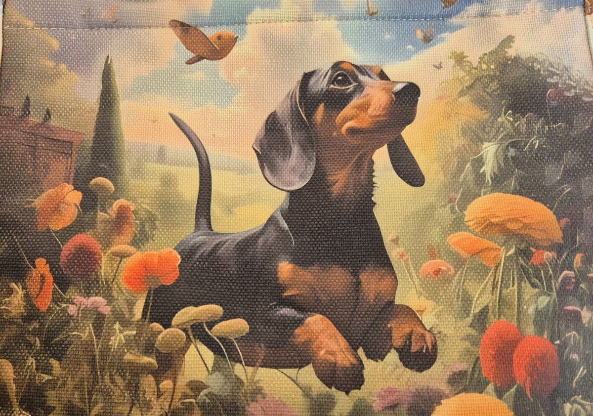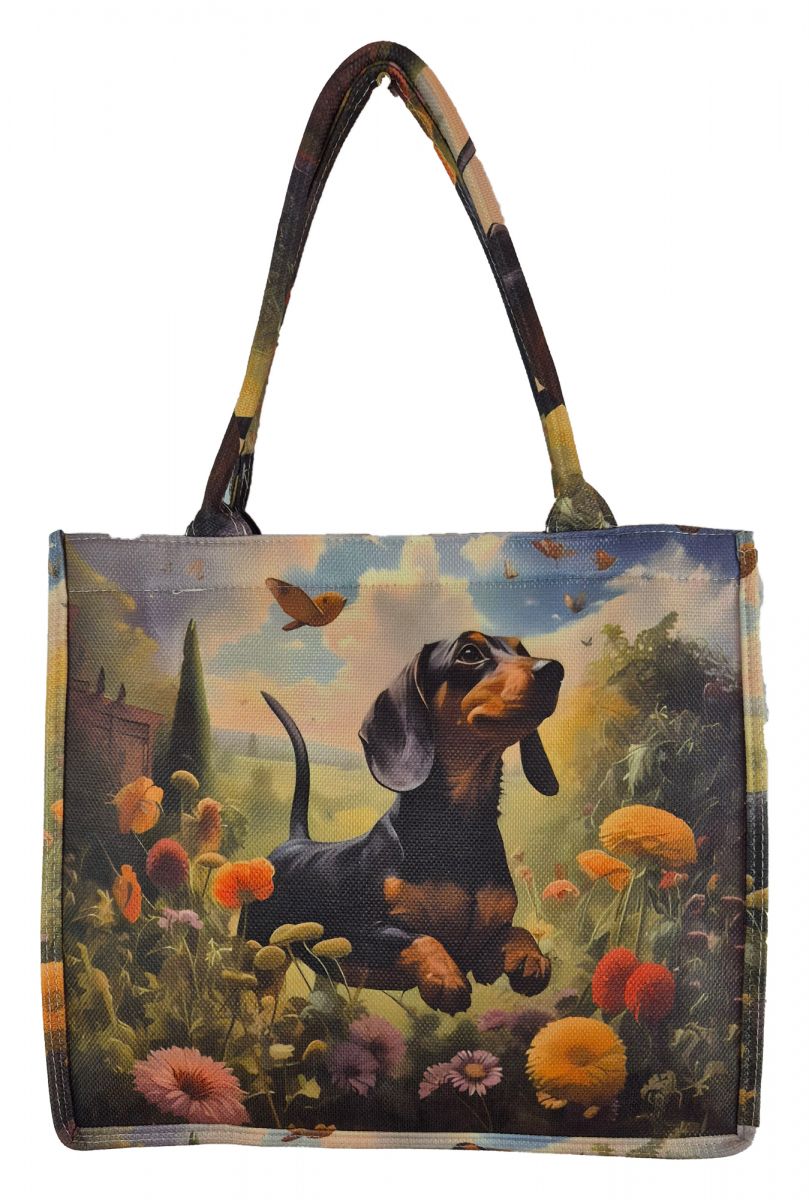 Diese Shoppertasche ist der absolute Hit für jede Dackel-Besitzerin. Sie ist auch eine bildschöne phantastische Strandtasche, perfekt für Ihren Urlaub oder für das Strandbad zu Hause. Das Design zeigt einen total süßen Dackel, der auf der Blumenwiese gerade den Schmetterlingen nachjagt.