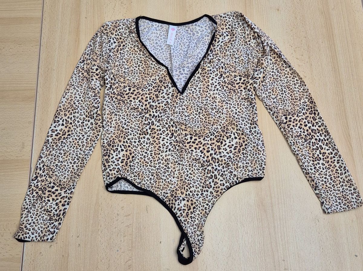 Ein wunderschöner Body mit modisch aktuellem Leoardenmuster. Ein feiner fließender Stoff umhüllt Ihre Figur, wunderbar angenehm zu tragen. Die lieferbaren Größen sind S und M. Material: 100% Polyester. Für die Frau mit dem besonders guten Geschmack.